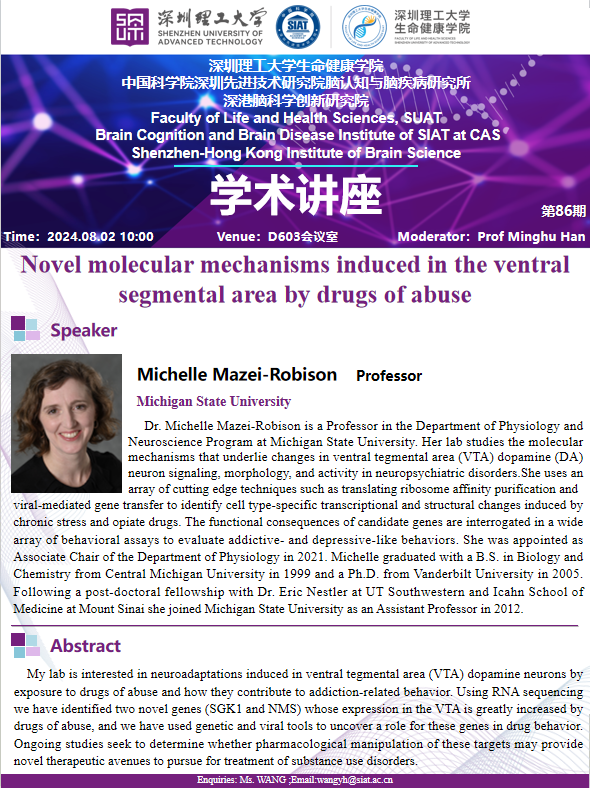 由Michigan State University,Michelle Mazei-Robison教授,带来题为“Novel molecular mechanisms induced in the ventral segmental area by drugs of abuse”专题讲座。