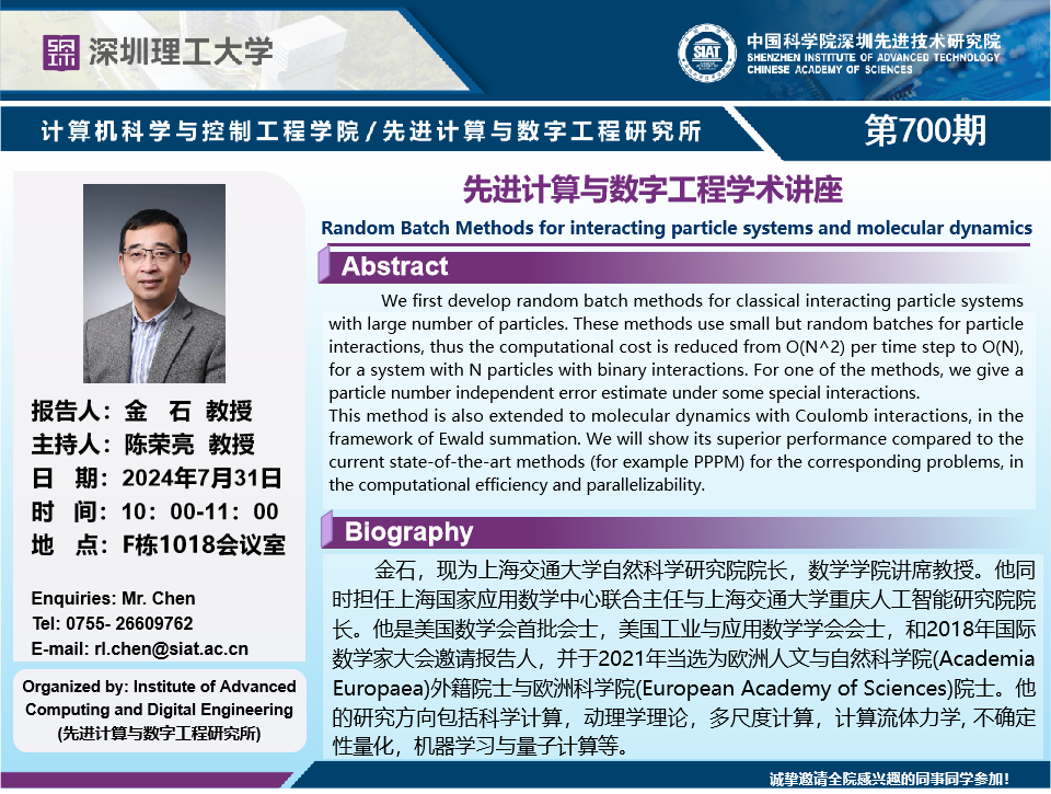 大家好!数字所/计算机学院第700期学术讲座将于7月31日10:00-11:00在F1018会议室举行,本次讲座将邀请上海交通大学 金石 教授作题为“Random Batch Methods for interacting particle systems and molecular dynamics”的报告。
