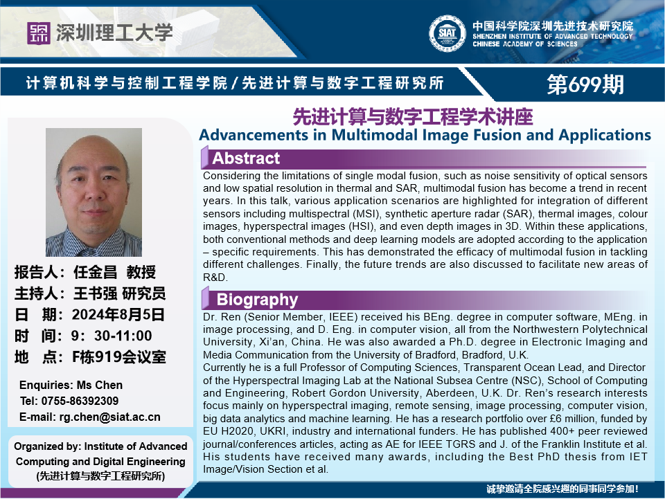 大家好!数字所/计算机学院第699期学术讲座将于8月5日9:30-11:00在F1119会议室举行,本次讲座将邀请英国罗伯特戈登大学 任金昌 教授作题为“Advancements in Multimodal Image Fusion and Applications”的报告。本次报告将由数字所 王书强 研究员主持,诚挚邀请大家参加、学习和交流!