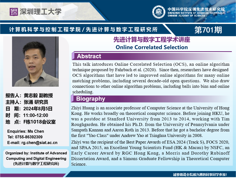 大家好!数字所/计算机学院第701期学术讲座将于8月5日11:00-12:00在F1018会议室举行,本次讲座将邀请香港大学 黄志毅 副教授作题为“Online Correlated Selection”的报告。本次报告将由数字所 张涌 研究员主持,诚挚邀请大家参加、学习和交流!