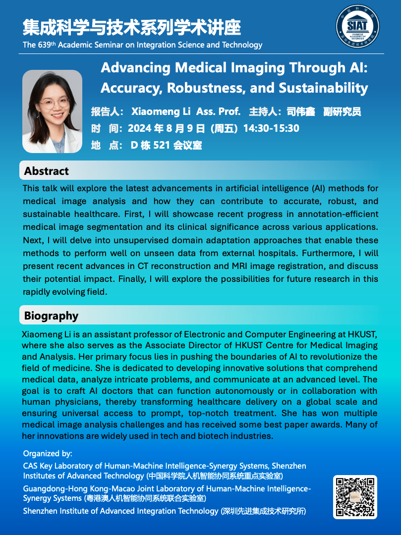 集成所 第640期 集成科学与技术系列学术讲座将于 2024 年 8 月 9 日(周五)14:30-15:30 在 D 栋 521 会议室 召开,本次讲座特邀 香港科技大学 的 Xiaomeng Li Assistant Professor 作题为《Advancing Medical Imaging Through AI: Accuracy, Robustness, and Sustainability 》的学术报告。