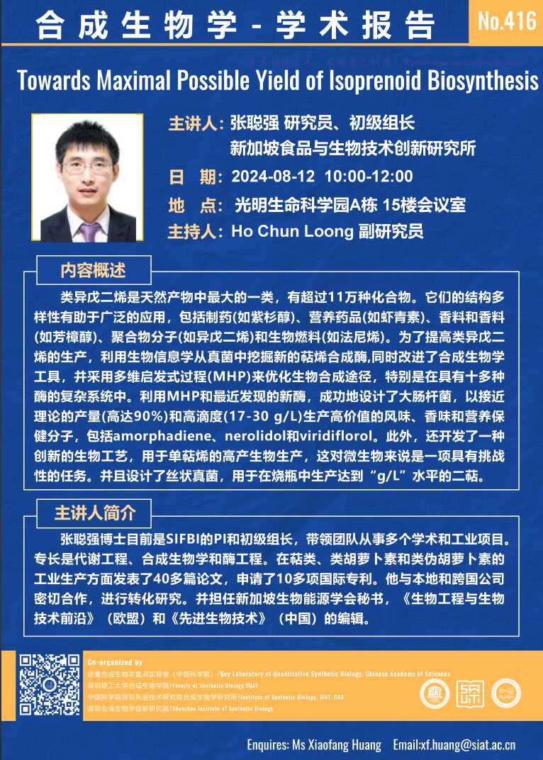 本次讲座邀请了 张聪强 研究员 带来题为“Towards Maximal Possible Yield of Isoprenoid Biosynthesis”的报告。
