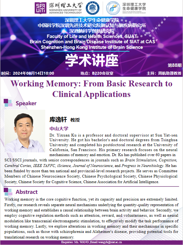 生命健康学院将于08月14日 10:00,地点:B220会议室 举办第88期学术讲座。 由中山大学,库逸轩教授,带来题为“Working Memory: From Basic Research to Clinical Applications”专题讲座。 诚挚邀请大家学习交流!