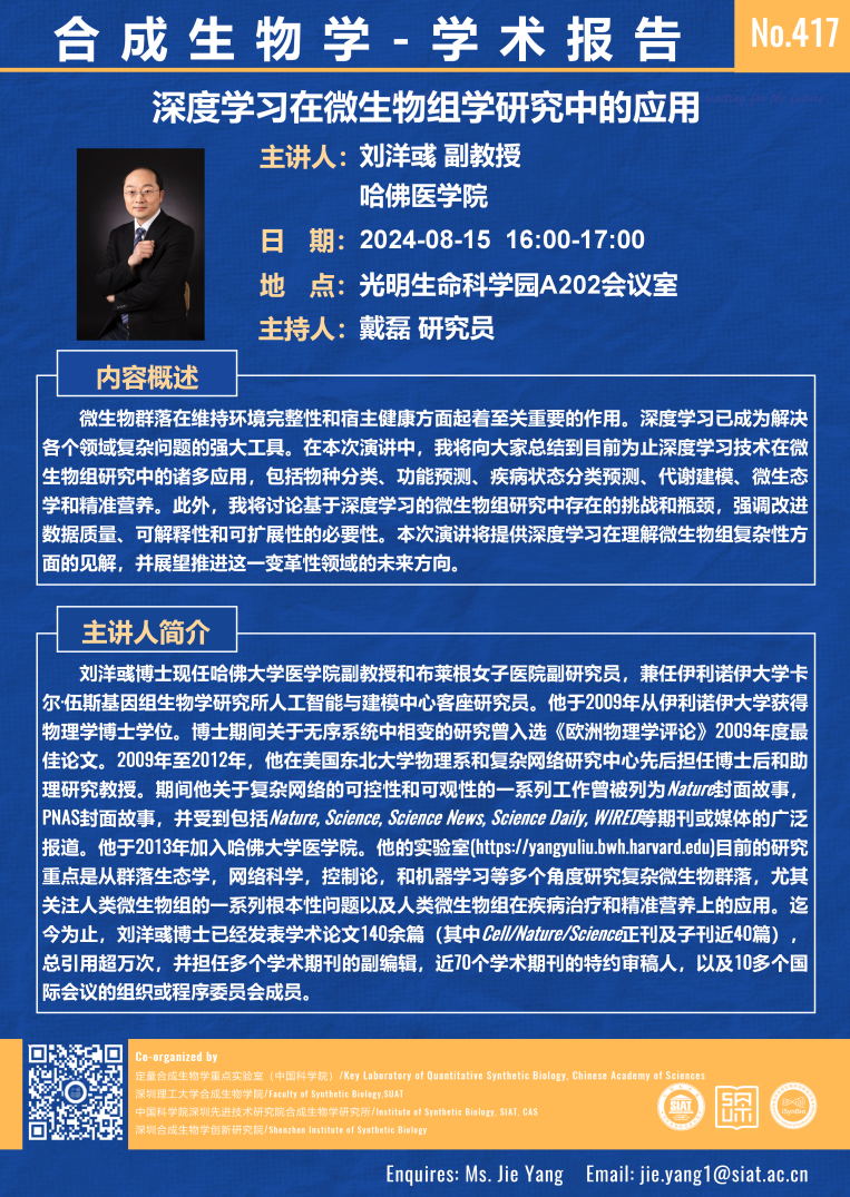 各位老师、同学、同事: 大家好!合成所/合成生物学院第417期学术讲座将于 8月15日(星期四)16:00-17:00 在 光明生命科学园A202会议室 举行。