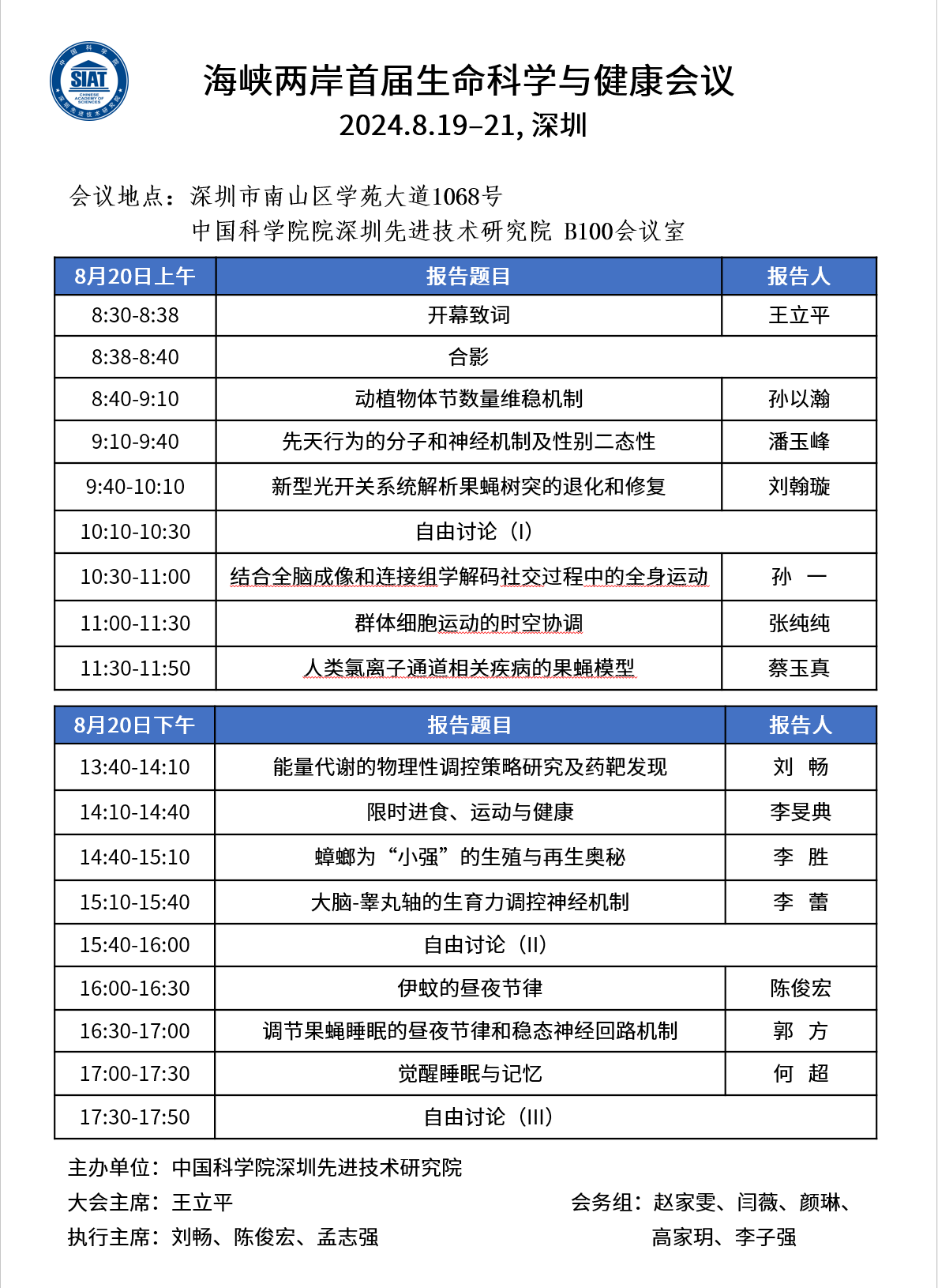 大家好!为深入探索生命体的运作机制,增进两岸在生命科学与健康领域的合作共识及科研工作者的学术交流,先进院脑所将举办本次海峡两岸首届生命科学与健康会议。会议时间: 2024年8月20日(星期二)会议地点: 先进院(西丽)B100 因本次会议涉及未发表数据,没有线上会议。诚挚欢迎大家现场参会,共同学习交流!