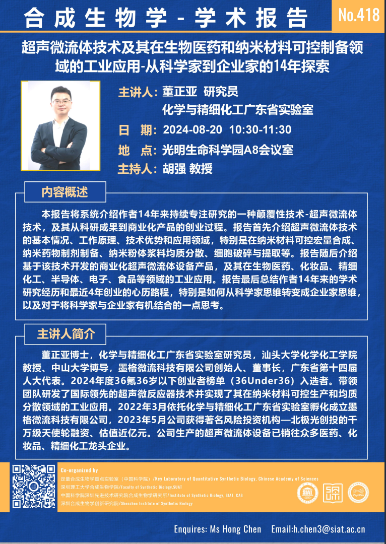 【2024年8月20日 合成所/合成生物学院】超声微流体技术及其在生物医药和纳米材料可控制备领域的工业应用-从科学家到企业家的14年探索
