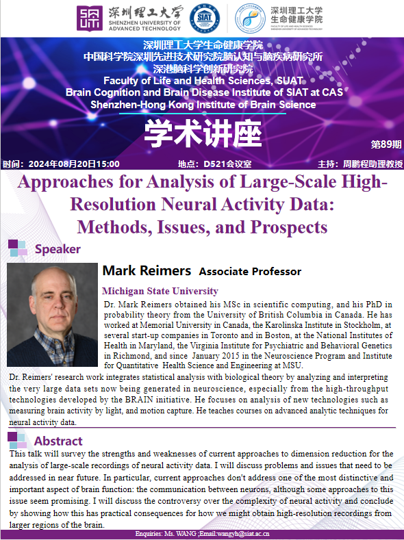 大家好! 生命健康学院将于08月20日 15:00,地点:D521会议室 举办第89期学术讲座。 由Michigan State University,Mark Reimers 副教授,带来题为“Approaches for Analysis of Large-Scale High-Resolution Neural Activity Data: Methods, Issues, and Prospects”专题讲座。 诚挚邀请大家学习交流!