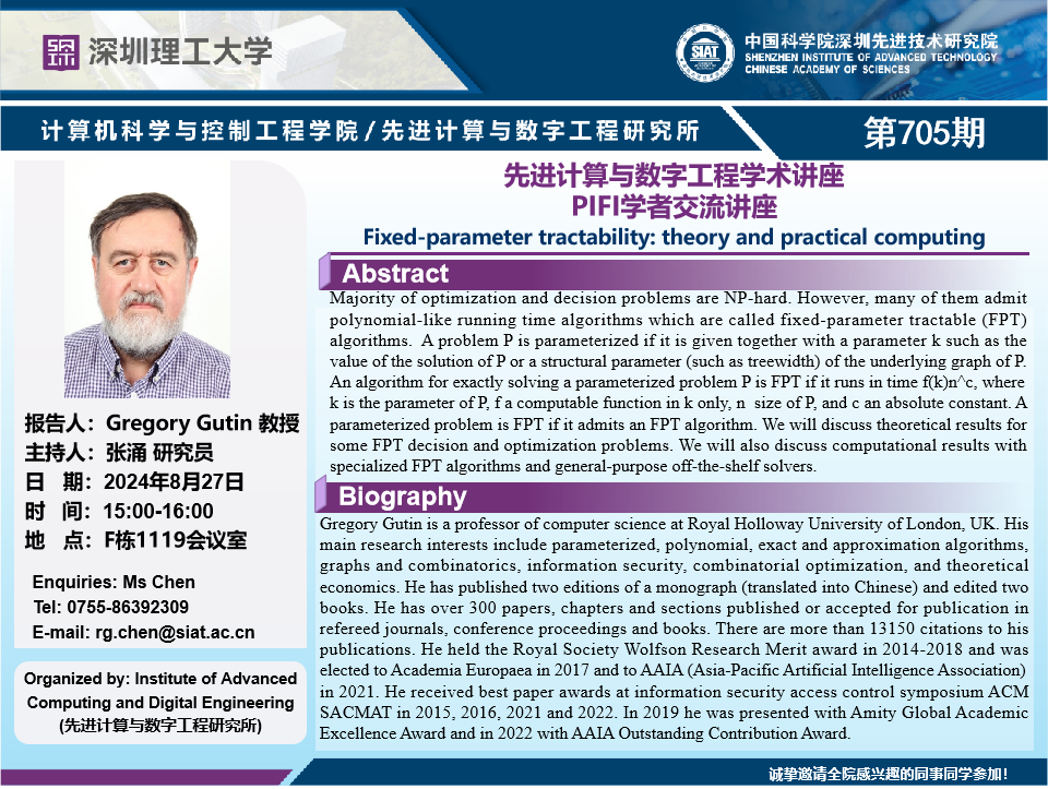 数字所/计算机学院第705期学术讲座将于8月27日15:00-16:00在F1119会议室举行,本次讲座将邀请伦敦大学皇家霍洛威学院(Royal Holloway, University of London) Gregory Gutin 教授作题为“Fixed-parameter tractability: theory and practical computing”的报告。本次报告将由数字所 张涌 研究员主持,诚挚邀请大家参加、学习和交流!
