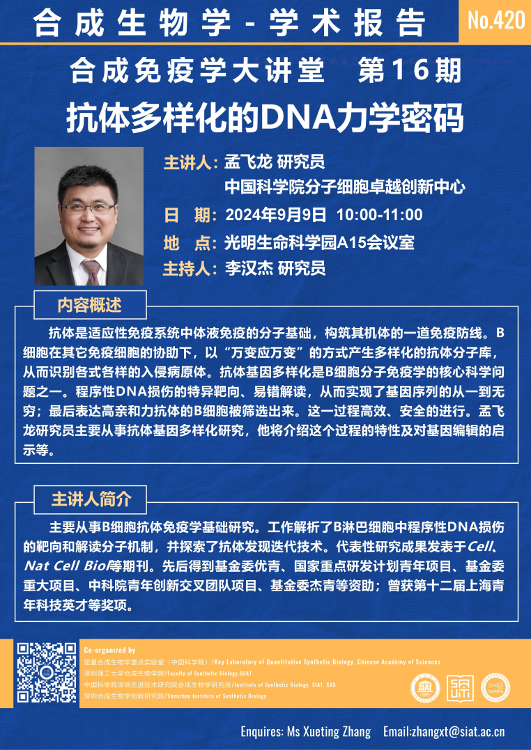本次讲座邀请了 孟飞龙 研究员 带来题为“抗体多样化的DNA力学密码”的报告。