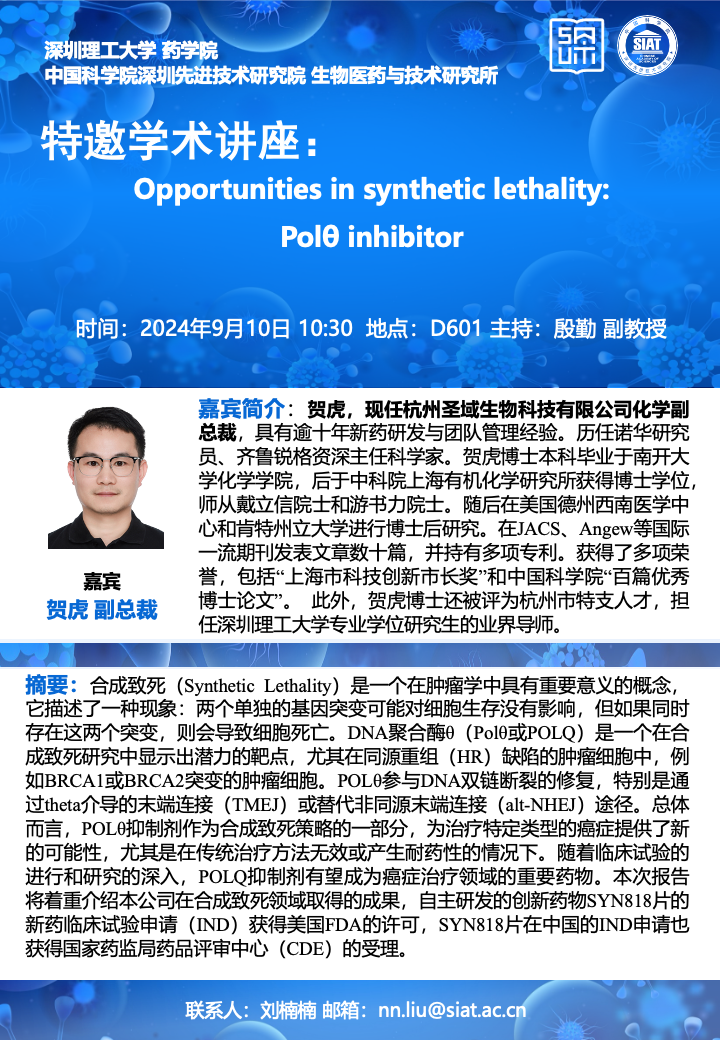 大家好!药学院/医药所“特邀学术讲座”系列将于2024年09月10日(周二)10:30,在先进院D601会议室举行。本次讲座邀请了来自杭州圣域生物科技有限公司的贺虎 副总裁带来英文题为“Opportunities in synthetic lethality: Polθ inhibitor”的报告。届时,殷勤 副教授将主持讲座。