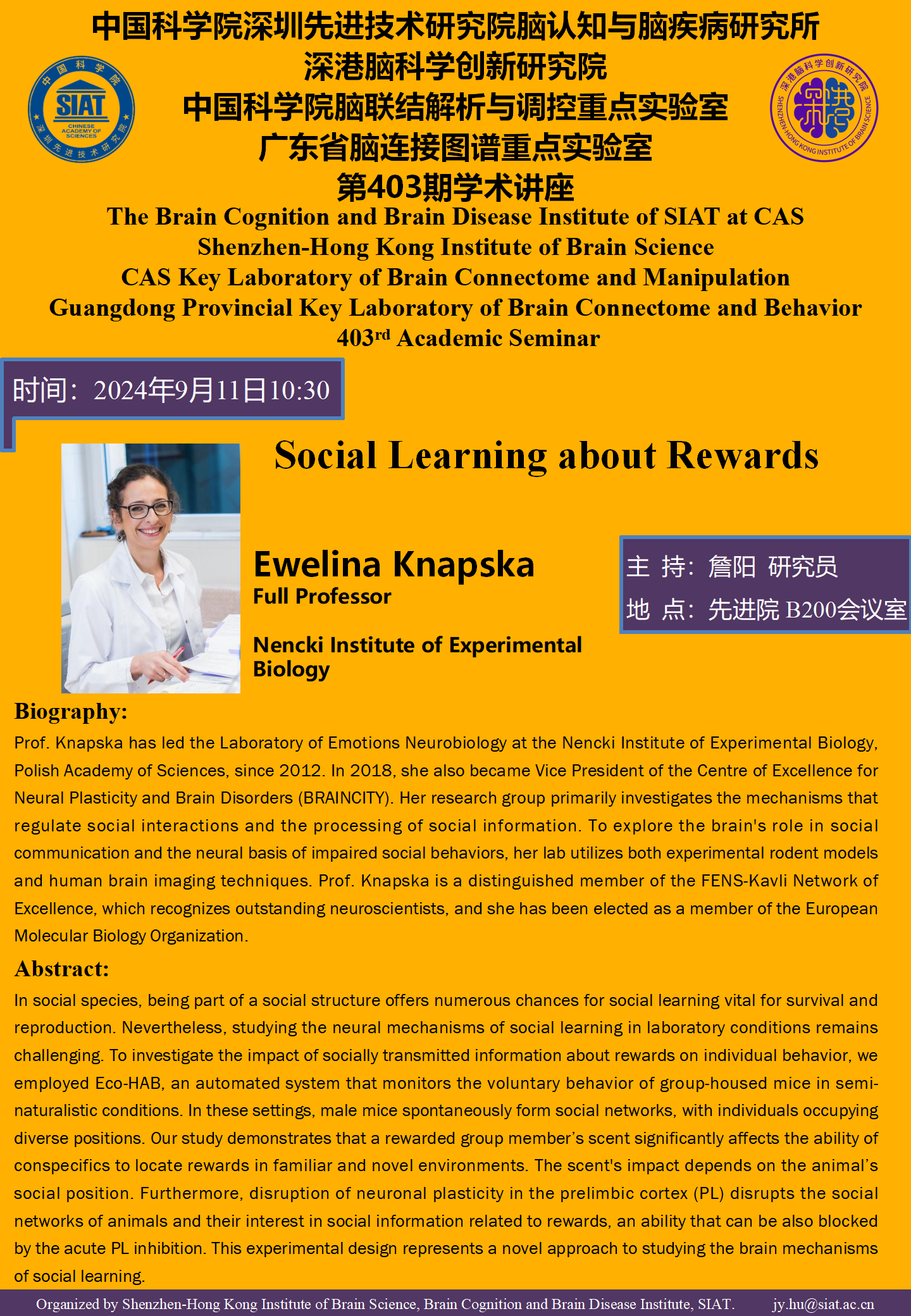 脑所/深港脑院将于9月11日(星期三) 10:30,地点:B200 会议室 举办第403期学术讲座。本次讲座邀请到Nencki Institute of Experimental Biology,Prof. Ewelina Knapska,带来题为“Social Learning about Rewards”的报告。 届时,詹阳 研究员将主持讲座。 诚挚邀请大家参与学习交流!