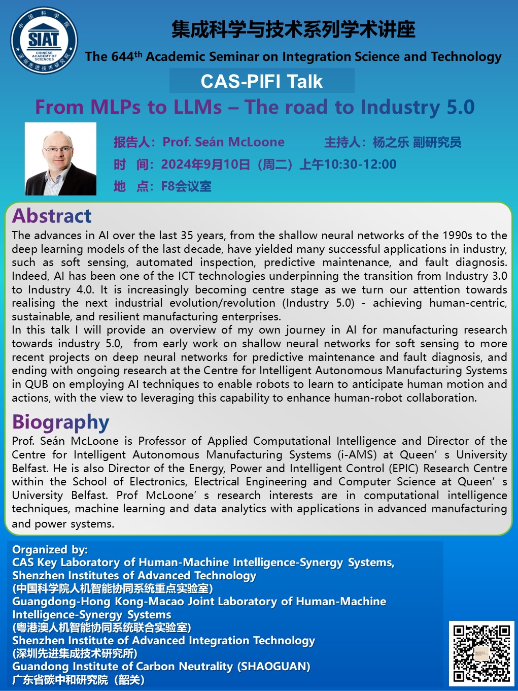 集成所第644期集成科学与技术系列学术讲座将于2024年9月10日(周二)上午10:30-12:00在F8会议室召开,本次讲座特邀Queen’s University Belfast的Prof. Seán McLoone作题为《From MLPs to LLMs – The road to Industry 5.0》的学术报告。