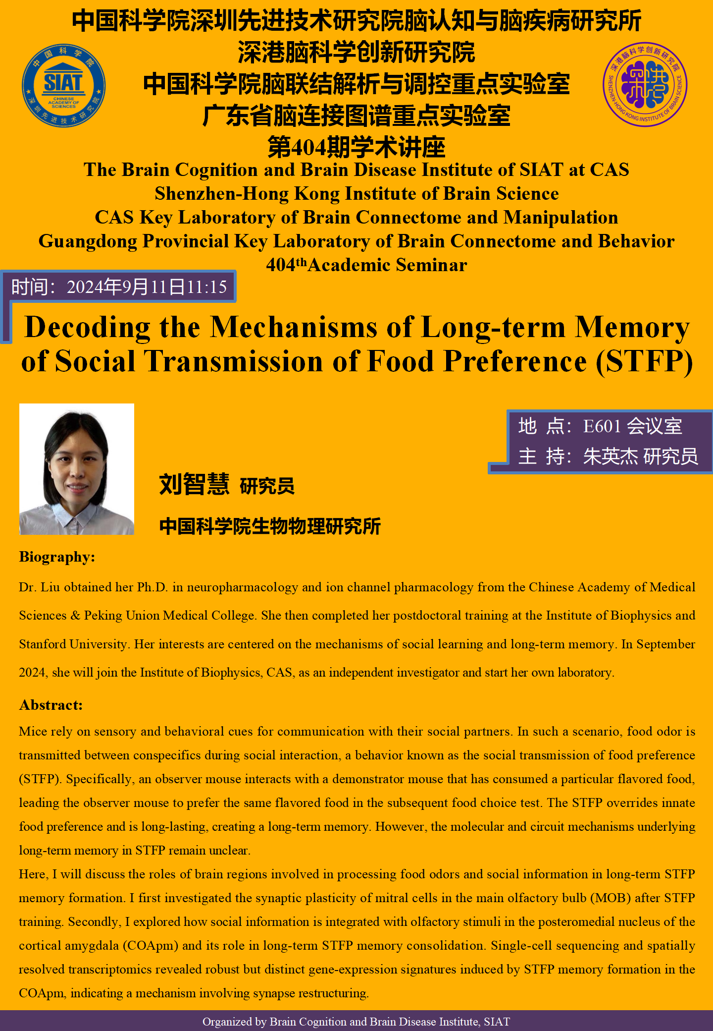 脑所/深港脑院将于9月11日(星期三) 11:15,地点:E601 会议室 举办第404期学术讲座。本次讲座邀请到中国科学院生物物理研究所,刘智慧 研究员,带来题为“Decoding the Mechanisms of Long-term Memory of Social Transmission of Food Preference (STFP)”的报告。