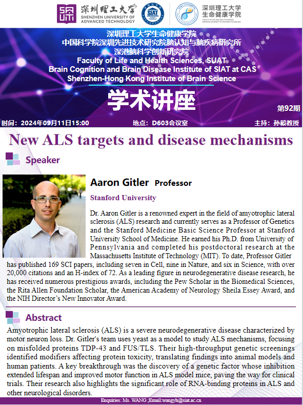 由Stanford University,Aaron Gitler教授,带来题为“New ALS targets and disease mechanisms”专题讲座。