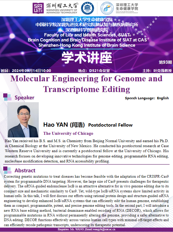 由The University of Chicago,Hao YAN (闫浩)博士,带来题为“Molecular Engineering for Genome and Transcriptome Editing”专题讲座。