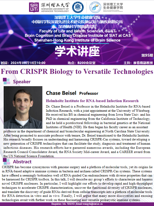 由亥姆霍兹RNA感染研究所,Chase Beisel 教授,带来题为“From CRISPR Biology to Versatile Technologies”专题讲座。
