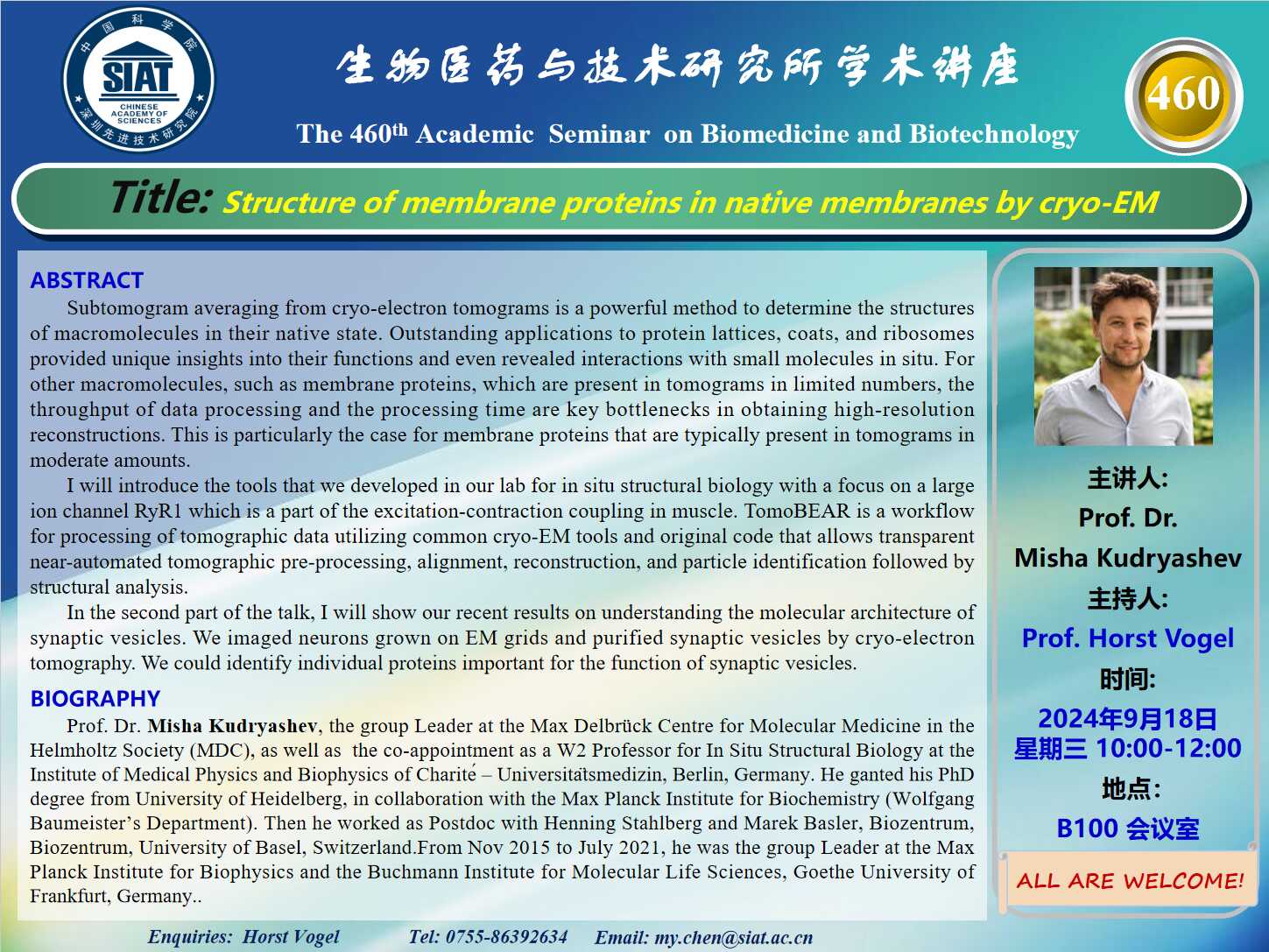 大家好! 医药所第460期学术讲座将于2024年9月18日 星期三 10:00-11:00 B100会议室举行。本次讲座邀请了来自亥姆霍兹学会 (MDC) 马克斯·德尔布吕克分子医学中心 Misha Kudryashev 教授带来“Structure of membrane proteins in native membranes by cryo-EM”的报告。届时,Horst Vogel 教授将主持讲座。
