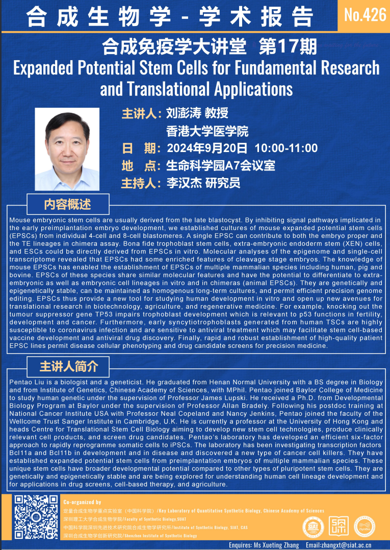 【2024年9月20日 合成所/合成生物学院】Expanded Potential Stem Cells for Fundamental Research and Translational Applications