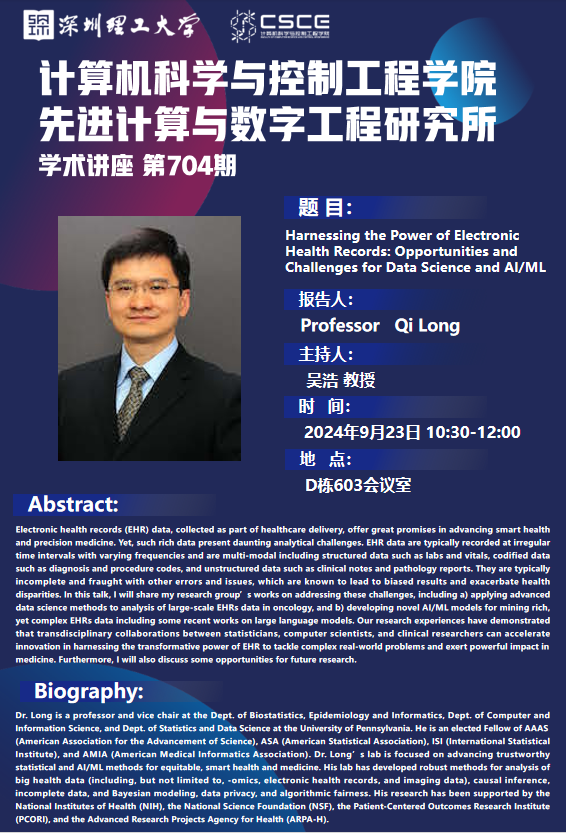 大家好!计算机学院/先进计算与数字工程研究所学术讲座第709期将于9月23日10:30-12:00在D栋603会议室举行,本次讲座将邀请宾夕法尼亚大学,Qi Long 教授作题为“Harnessing the Power of Electronic Health Records: Opportunities and Challenges for Data Science and AI/ML”的报告。本次报告将由计算机学院 吴浩 教授主持,诚挚邀请大家参加、学习和交流!
