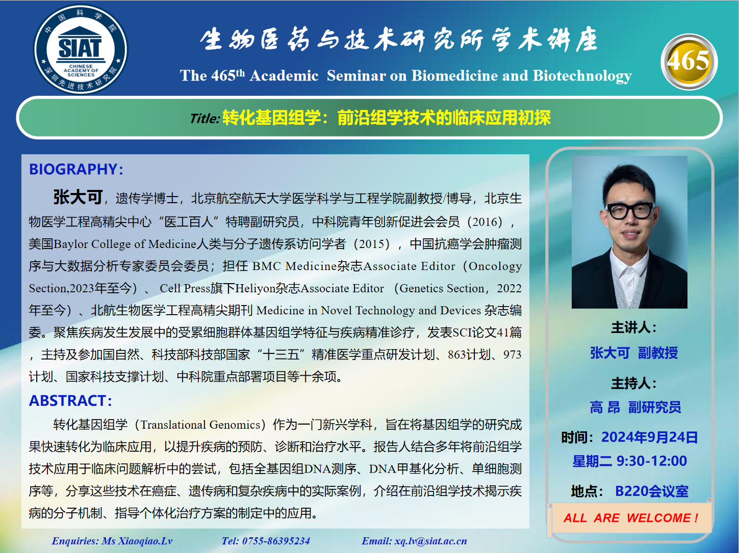 大家好! 医药所第465期学术讲座将于2024年9月24日 星期二 9:30-12:00 B220会议室举行。本次讲座邀请了来自北京航空航天大学 张大可 副教授带来“转化基因组学:前沿组学技术的临床应用初探”的报告。届时, 高 昂 副研究员将主持讲座。