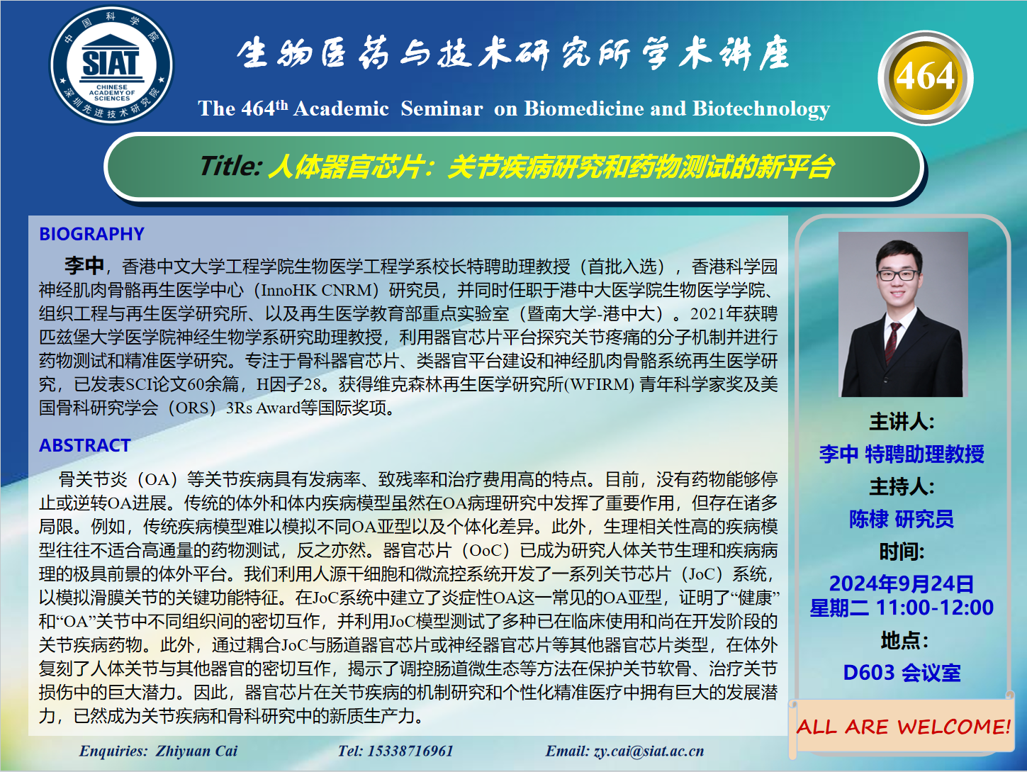 大家好! 医药所第464期学术讲座将于2024年9月24日 星期二 11:00-12:00 D603会议室举行。本次讲座邀请了来自香港中文大学 李中 特聘助理教授带来“人体器官芯片:关节疾病研究和药物测试的新平台”的报告。届时, 陈棣 研究员将主持讲座。