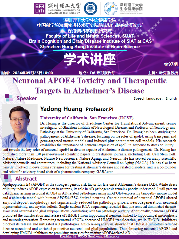 由University of California, San Francisco,Huang Yadong教授,带来题为“Neuronal APOE4 Toxicity and Therapeutic Targets in Alzheimer's Disease”专题讲座。