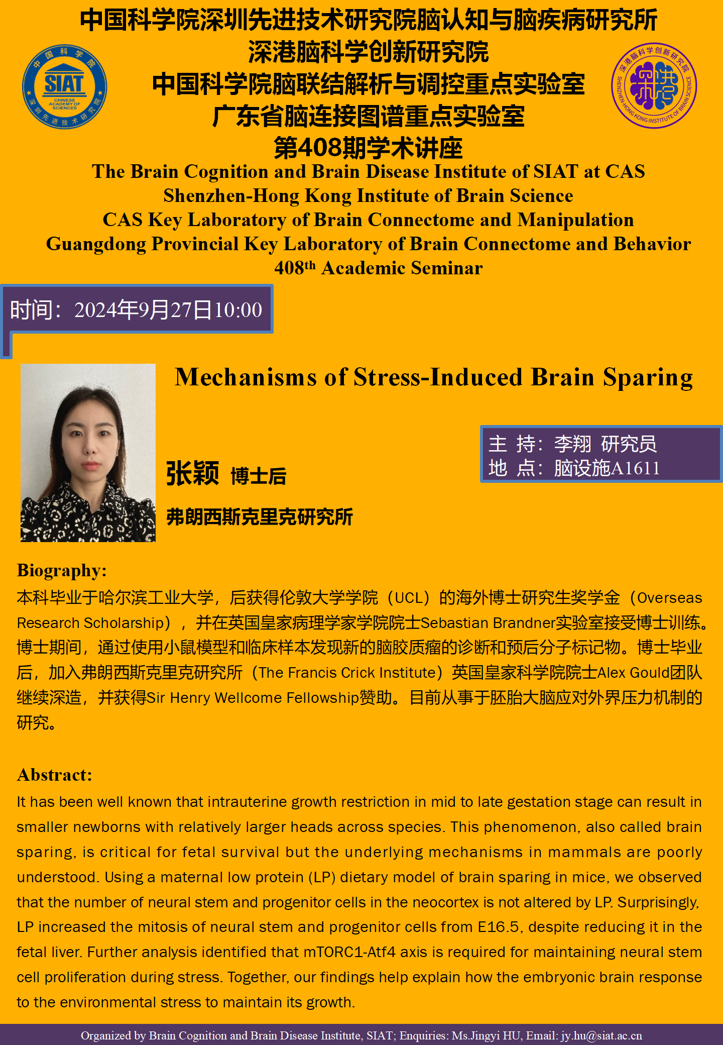 脑所/深港脑院将于9月27日(星期五) 10:00,地点:脑设施 A1611 会议室 举办第408期学术讲座。本次讲座邀请到弗朗西斯克里克研究所 张颖 博士后,带来题为“Mechanisms of Stress-Induced Brain Sparing”的报告。