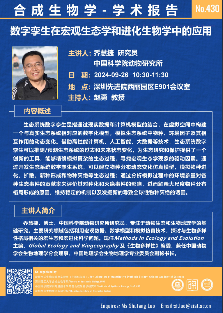 本次讲座邀请了 乔慧捷 研究员 带来题为“数字孪生在宏观生态学和进化生物学中的应用”的报告。