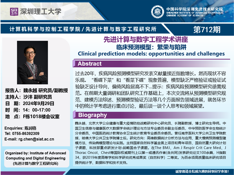 大家好!数字所/计算机学院第712期学术讲座将于9月29日14:00-17:00在F1018会议室举行,本次讲座将邀请北京大学公众健康与重大疫情防控战略研究中心 魏永越 研究员/副教授作题为“临床预测模型:繁荣与陷阱(Clinical prediction models: opportunities and challenges)”的报告。本次报告将由数字所 沙沣 副研究员主持,诚挚邀请大家参加、学习和交流!