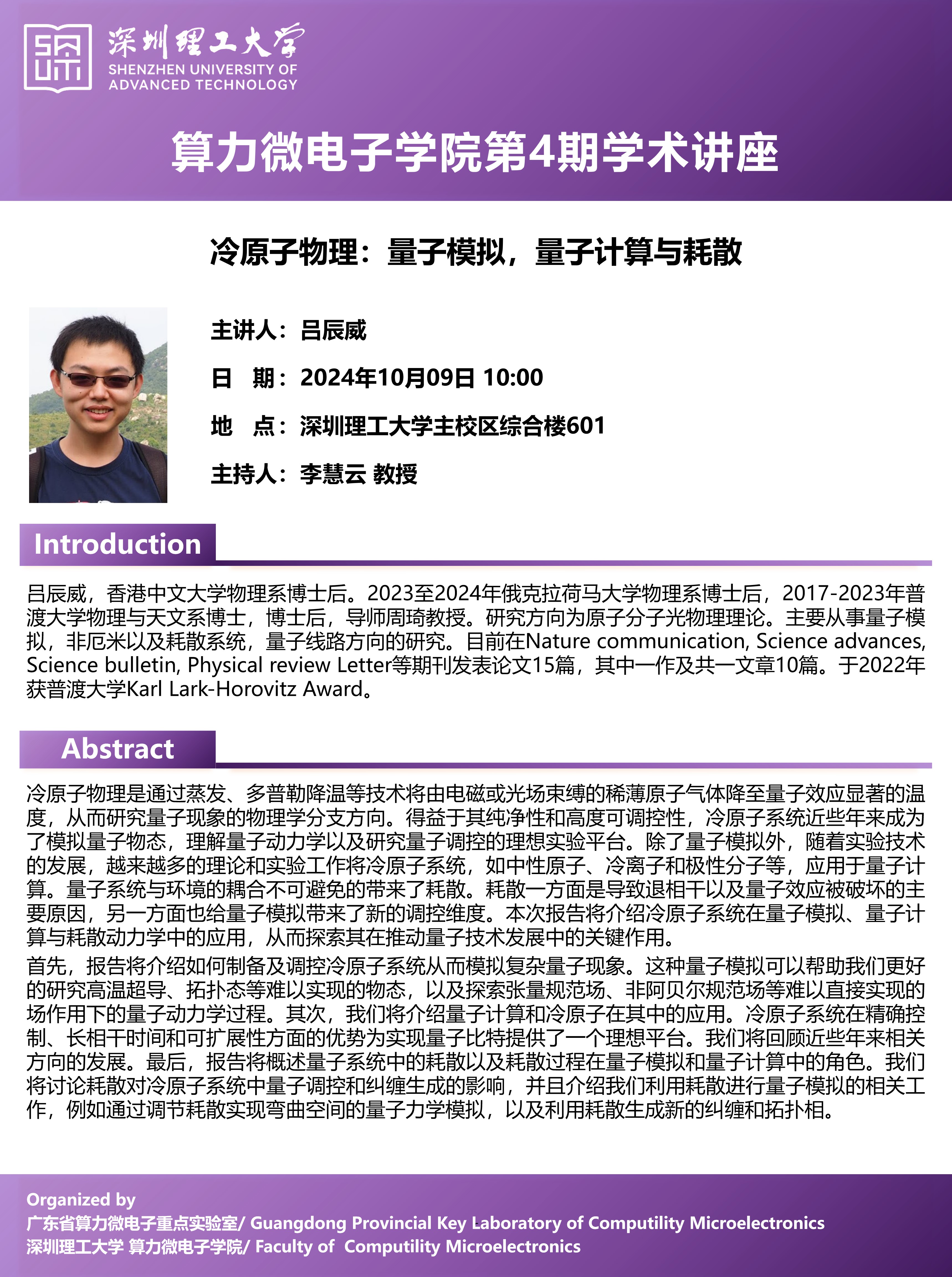 深圳理工大学算力微电子学院第4期学术讲座将于2024年10月9日(周三)上午10:00在深圳理工大学主校区综合楼601会议室举办,特邀香港中文大学物理系博士后——吕辰威,作题为“冷原子物理:量子模拟,量子计算与耗散”专题讲座。