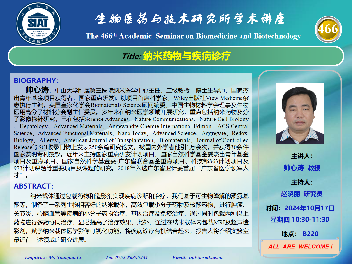 大家好! 医药所第466期学术讲座将于2024年10月17日 星期四 10:30-11:30 B220会议室举行。本次讲座邀请了来自中山大学附属第三医院 帅心涛 教授带来“纳米药物与疾病诊疗”的报告。届时, 赵晓丽 研究员将主持讲座。