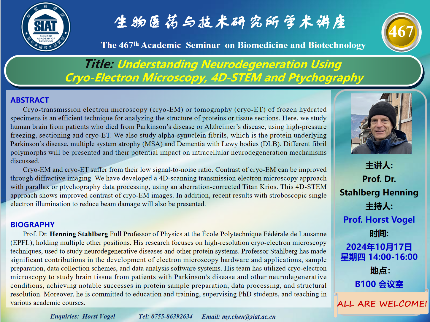 大家好! 医药所第467期学术讲座将于2024年10月17日 星期四 14:00-16:00 B100会议室举行。本次讲座邀请了来自瑞士洛桑联邦理工学院 Prof. Dr. Stahlberg Henning带来“Understanding Neurodegeneration, using Cryo-Electron Microscopy, 4D-STEM and Ptychography”的报告。届时, Prof. Horst Vogel 将主持讲座。