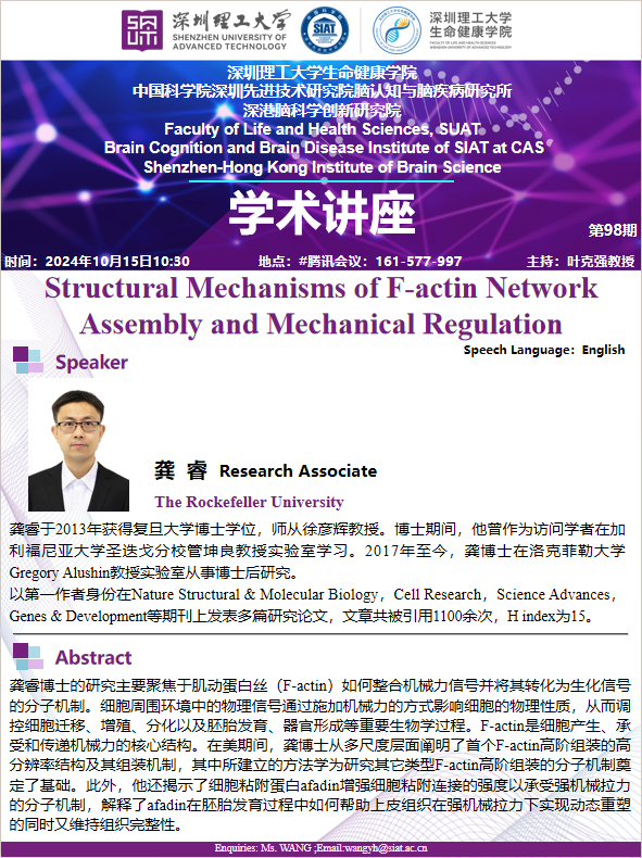 由The Rockefeller University,龚睿博士,带来题为“Structural Mechanisms of F-actin Network Assembly and Mechanical Regulation”专题讲座。