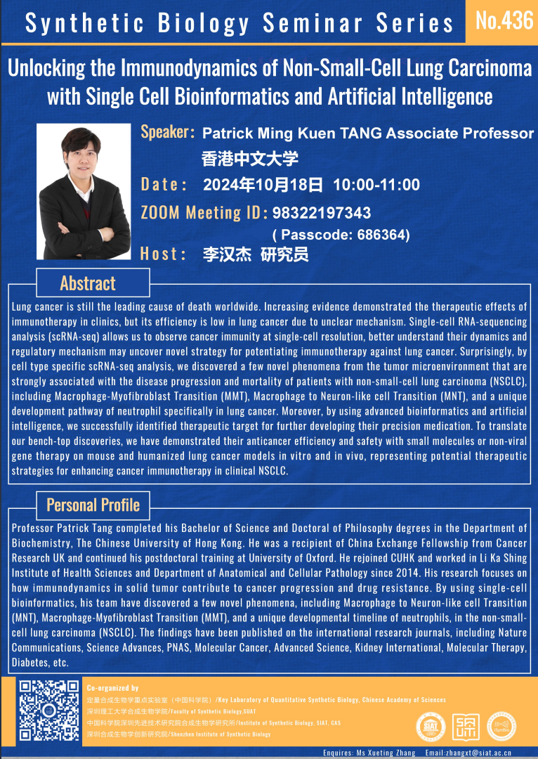 本次讲座邀请了 Patrick Ming Kuen TANG Associate Professor 带来题为“Unlocking the Immunodynamics of Non-Small-Cell Lung Carcinoma with Single Cell Bioinformatics and Artificial Intelligence”的报告。
