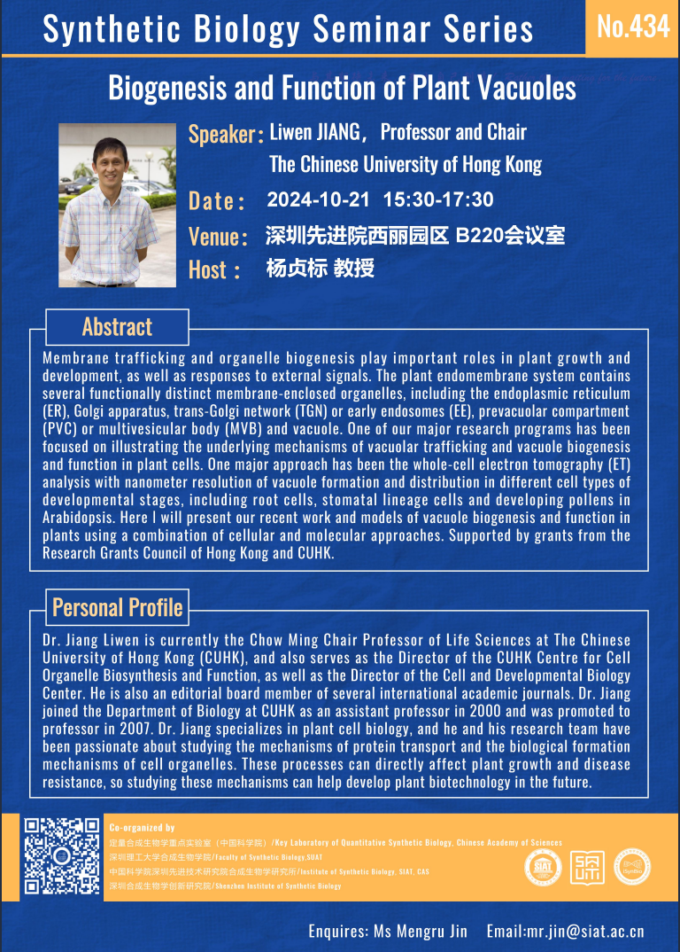【2024年10月21日 合成所/合成生物学院】Biogenesis and Function of Plant Vacuoles