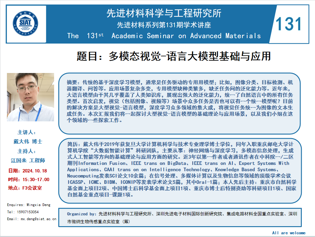 本次讲座邀请了 重庆邮电大学 戴大伟 博士 带来题为“多模态视觉-语言大模型基础与应用”的报告。