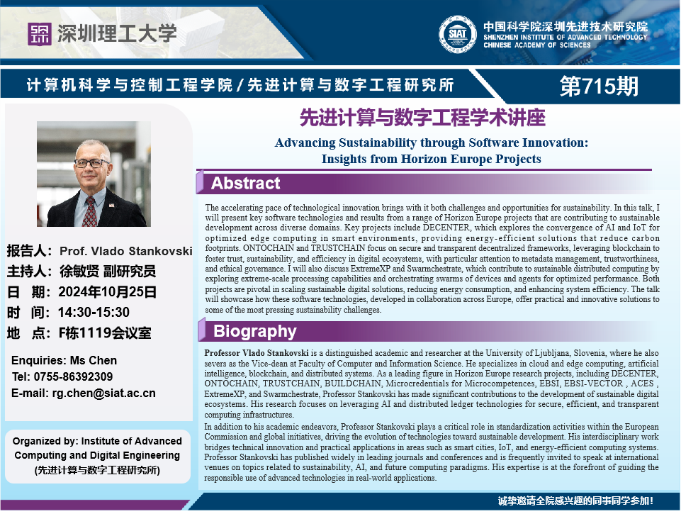 大家好!数字所/计算机学院第715期学术讲座将于10月25日14:30-15:30在F1119会议室举行,本次讲座将邀请卢布尔雅那大学 Vlado Stankovski 教授作题为“Advancing Sustainability through Software Innovation: Insights from Horizon Europe Projects”的报告。本次报告将由数字所 徐敏贤 副研究员主持,诚挚邀请大家参加、学习和交流!