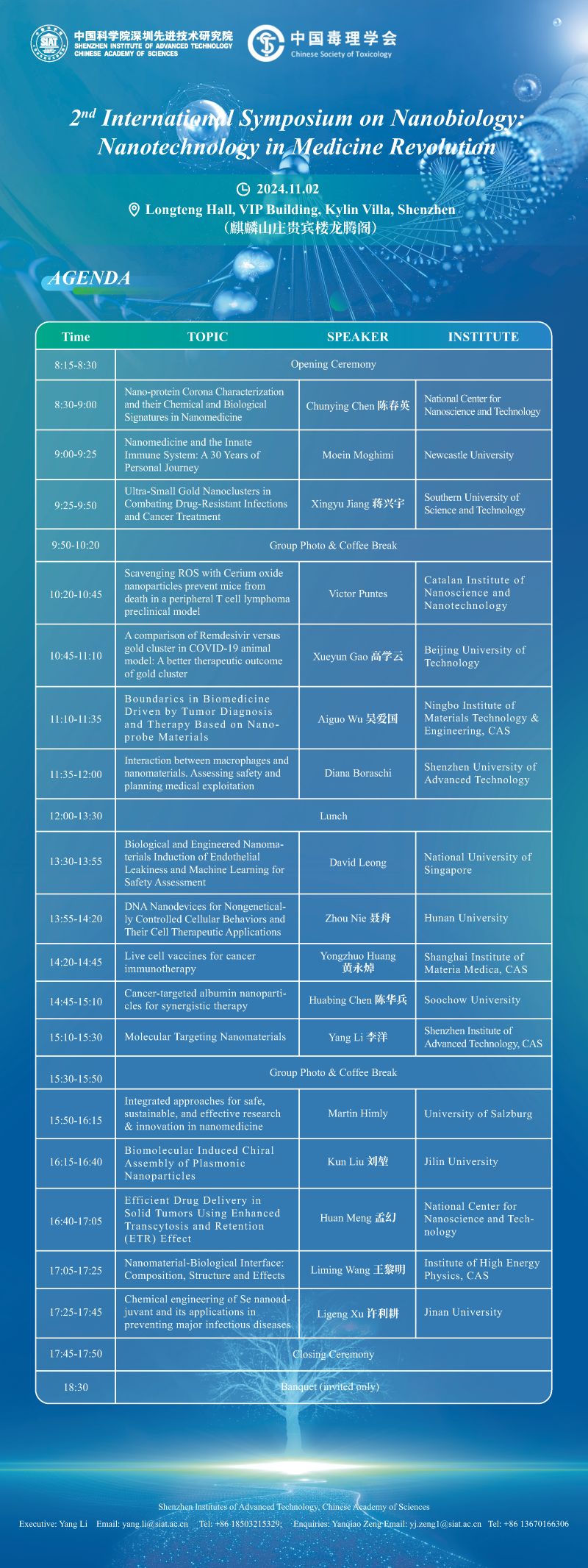 由中国科学院深圳先进技术研究院主办,中国毒理学会纳米毒理学专业委员会协办的第二届“纳米生物学国际研讨会”将于11月2日星期六在麒麟山庄贵宾楼龙腾阁召开。