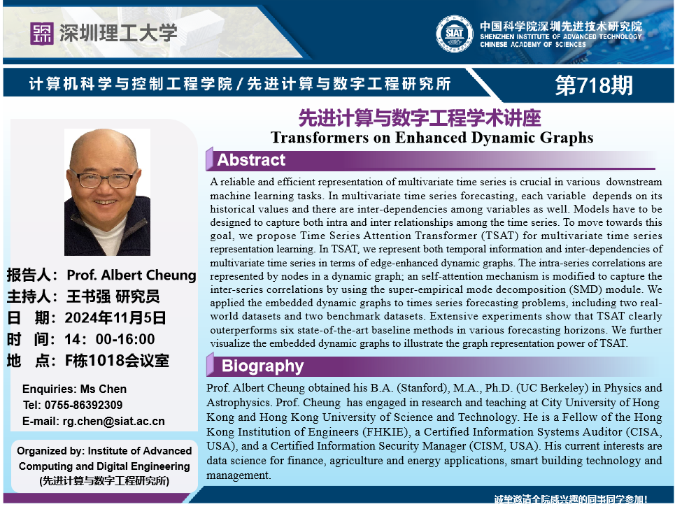 大家好!数字所/计算机学院718学术讲座将于11月5日14:00-16:00在F1018会议室举行,本次讲座将邀请香港科技大学 Albert Cheung 教授作题为Transformers on Enhanced Dynamic Graphs的报告。本次报告将由数字所 王书强 研究员主持,诚挚邀请大家参加、学习和交流!