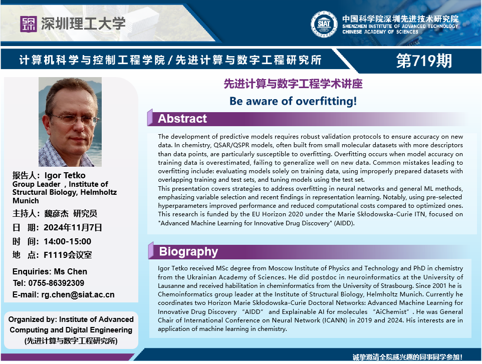 大家好!数字所/计算机学院第719期学术讲座将于11月7日14:00-15:00在F1119会议室举行,本次讲座将邀请慕尼黑亥姆霍兹中心(Helmholtz Munich) Igor Tetko 教授作题为“Be aware of overfitting”的报告。本次报告将由数字所 魏彦杰 研究员主持,诚挚邀请大家参加、学习和交流!
