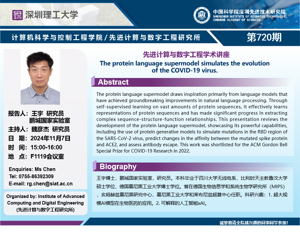 大家好!数字所/计算机学院第720期学术讲座将于11月7日15:00-16:00在F1119会议室举行,本次讲座将邀请鹏城国家实验室 王宇 研究员作题为“The protein language supermodel simulates the evolution of the COVID-19 virus”的报告。本次报告将由数字所 魏彦杰 研究员主持,诚挚邀请大家参加、学习和交流!