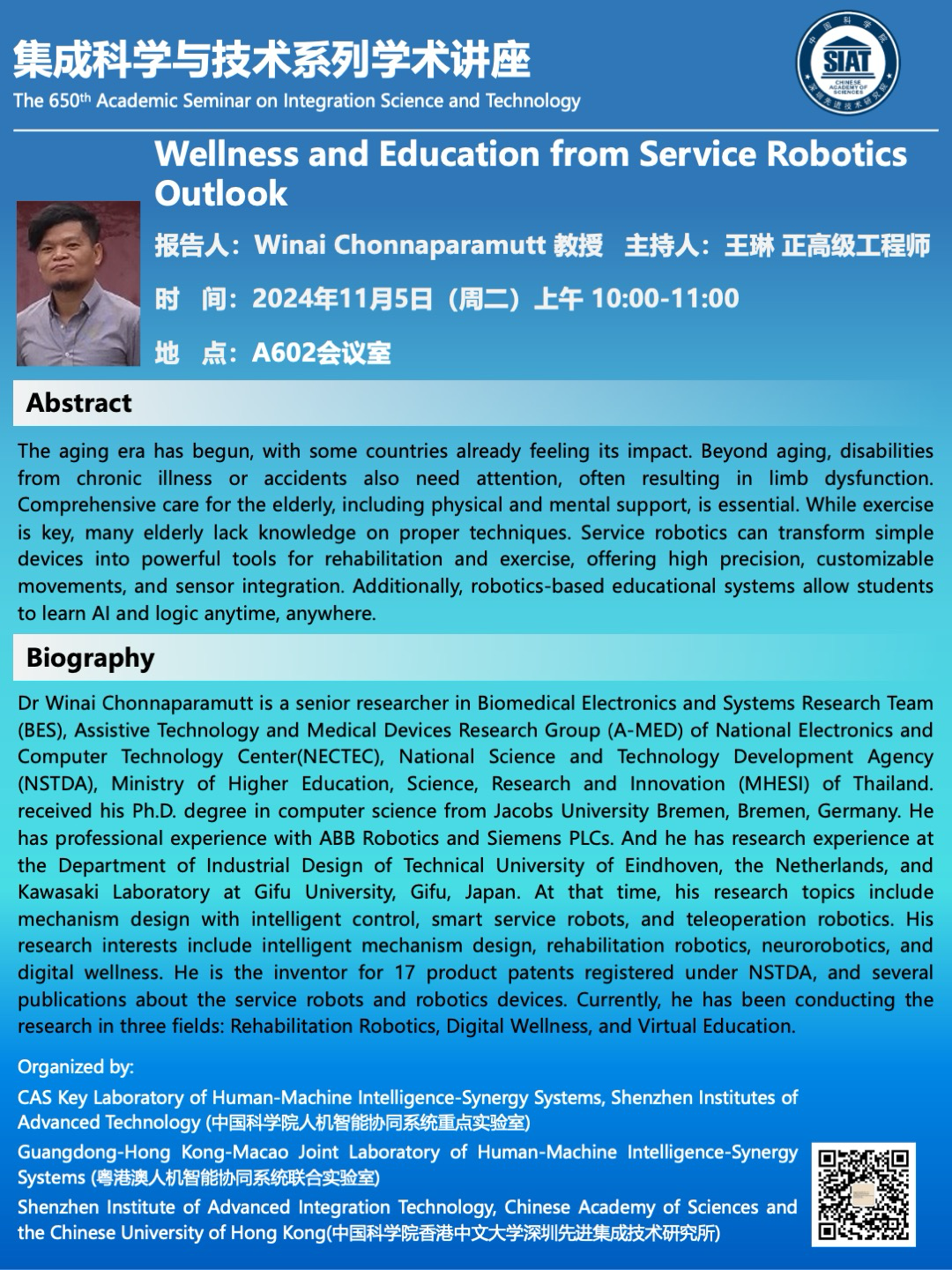 集成所第650期集成科学与技术系列学术讲座将于2024年11月5日(周二)上午 10:00-11:00 在A602会议室召开,本次讲座特邀 National Electronics and Computer Technology Center(Thailand) 的Winai Chonnaparamutt 教授 作题为《Wellness and Education from Service Robotics Outlook》的学术报告。