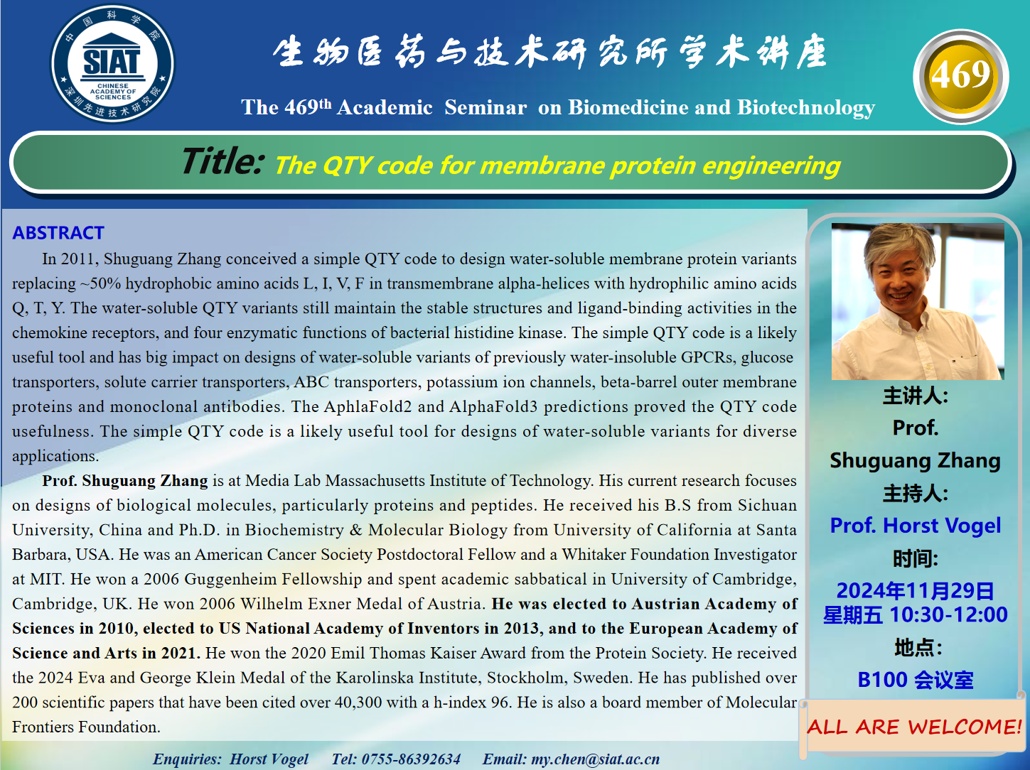 大家好! 医药所第469期学术讲座将于2024年11月29日 星期五 10:30-12:00 B100会议室举行。本次讲座邀请了来自麻省理工学院 Zhang Shuguang 教授带来“The QTY code for membrane protein engineering”的报告。届时, Horst Vogel 教授将主持讲座。