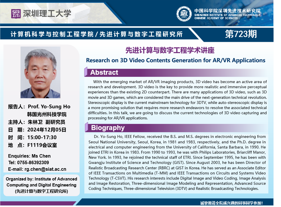 数字所/计算机学院第723期学术讲座将于12月05日15:00-17:30在F1119会议室举行,本次讲座将邀请韩国光州科技学院 Yo-Sung Ho 教授作题为“Research on 3D Video Contents Generation for AR/VR Applications”的报告。