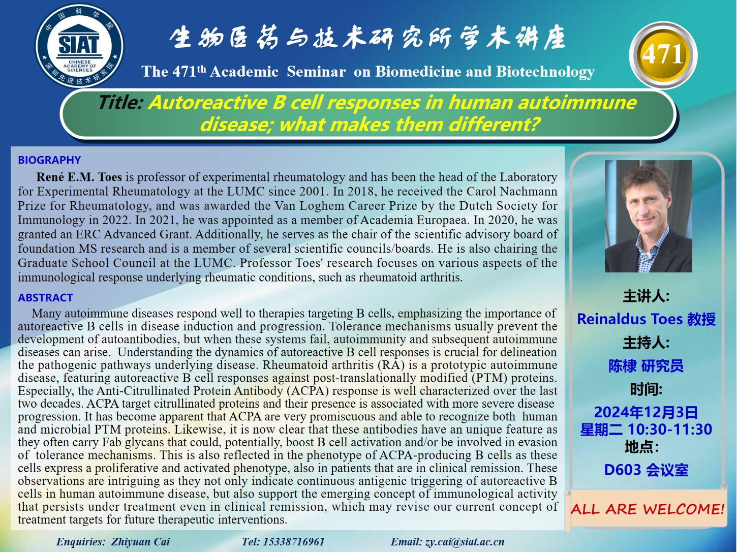 大家好! 医药所第471期学术讲座将于2024年12月3日 星期二 10:30-11:30 D603会议室举行。本次讲座邀请了来自荷兰莱顿大学 Reinaldus Toes 教授带来“Autoreactive B cell responses in human autoimmune disease; what makes them different?”的报告。届时,陈棣 研究员将主持讲座。