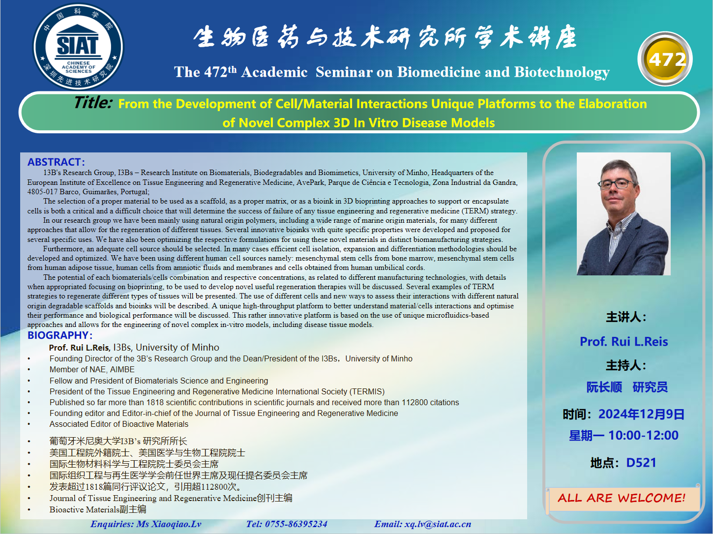 大家好! 医药所第472期学术讲座将于2024年12月9日 星期一 10:00-12:00 D521会议室举行。本次讲座邀请了来自葡萄牙米尼奥大学I3B's研究所 Prof. Rui L.Reis带来“From the Development of Cell/Material Interactions Unique Platforms to the Elaboration of Novel Complex 3D In Vitro Disease Models ”的报告。