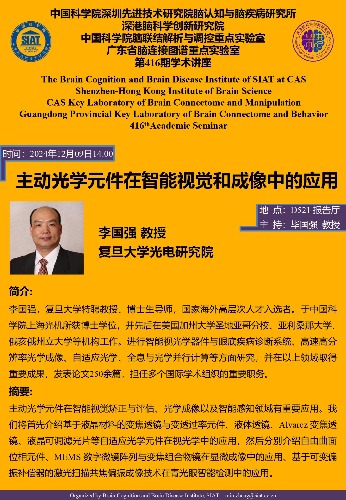 脑所/深港脑院将于12月9日(星期一) 14:00,地点:D521 会议室 举办第415期学术讲座。本次讲座邀请到复旦大学的 李国强教授 带来题为“主动光学元件在智能视觉和成像中的应用”的报告。