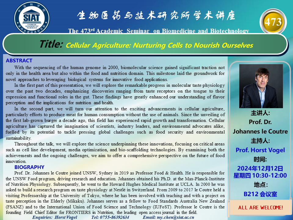 大家好! 医药所第473期学术讲座将于2024年12月12日 星期四 10:30-12:00 B212会议室举行。本次讲座邀请了来自新南威尔士大学 Prof. Dr. Johannes le Coutre 带来“Cellular Agriculture: Nurturing Cells to Nourish Ourselves ”的报告。届时,Horst Vogel 研究员将主持讲座。
