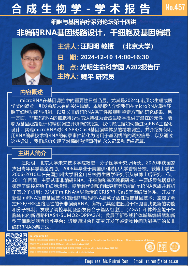 【2024年12月10日 合成所/合成生物学院】非编码RNA基因线路设计,干细胞及基因编辑
