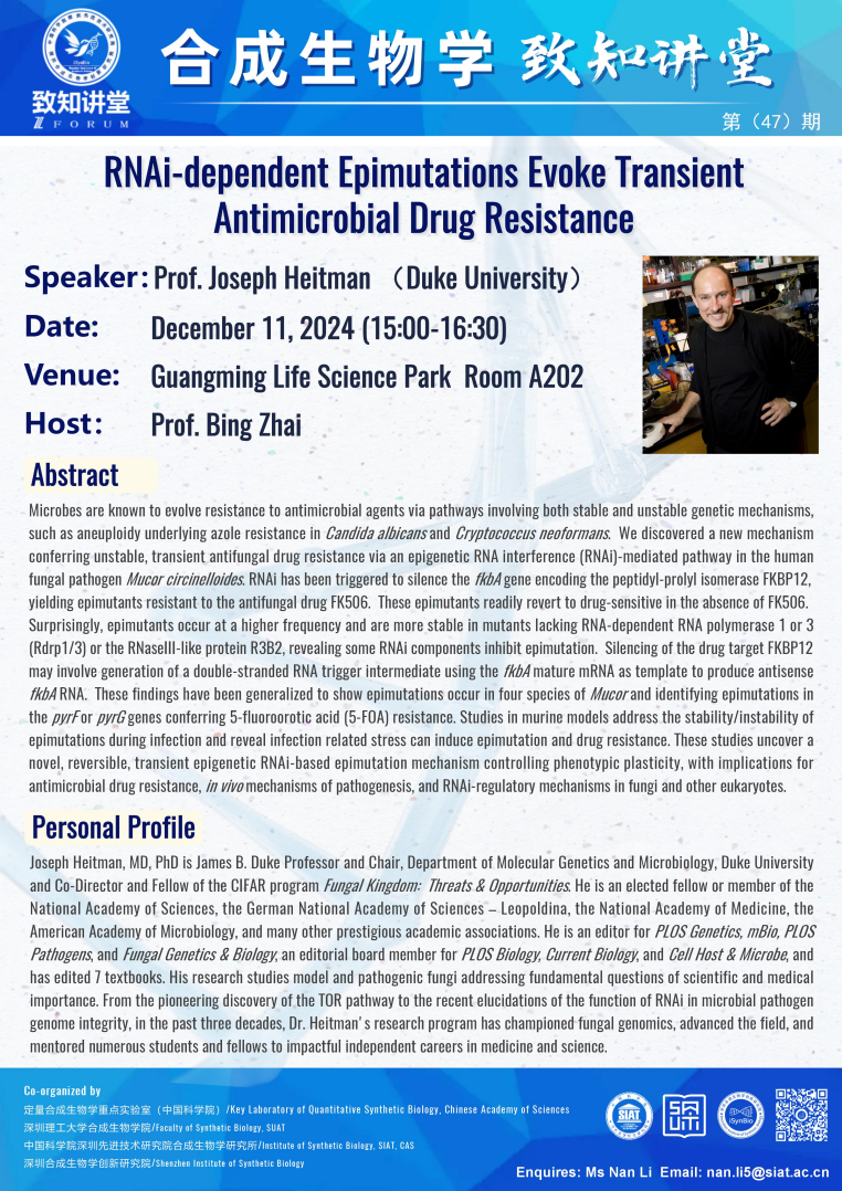 本次讲座邀请了 Prof. Joseph Heitman 带来题为“RNAi-dependent Epimutations Evoke Transient Antimicrobial Drug Resistance”的报告。